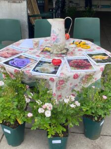 De tafels voorzien van bulletins en andere voorwerpen en zaken die met rozen te maken hebben.